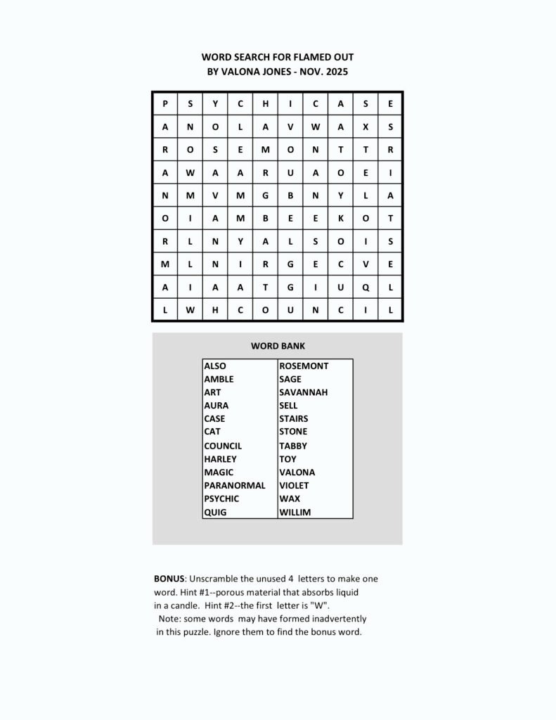 Welcome to our second puzzle entry for the month of November! This is a word search for Flamed Out by Valona Jones. Whether you’ve read the book or not, we’re sure you’ll have fun with this word search puzzle based on the story! (Click here to download the puzzle and play offline with a PDF version.)