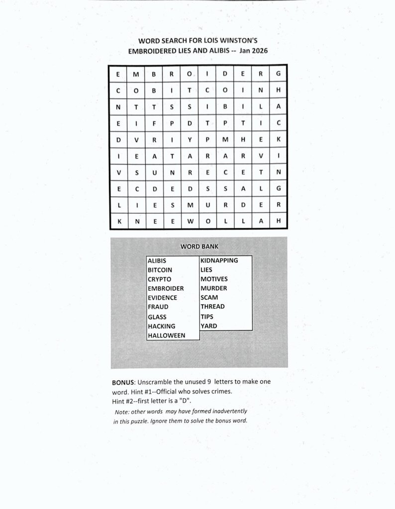 Word search for Embroidered Lies and Alibis by Lois Winston