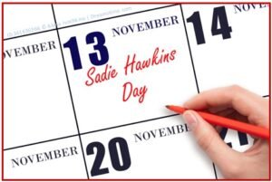 Today is Sadie Hawkins Day! This holiday was originally a fictional creation of cartoonist Al Capp (Alfred Gerald Caplin) in his Li’l Abner comic strip. In the cartoon, Hekzebiah Hawkins, afraid his daughter will never land a husband, declares a Sadie Hawkins Day during which she can break the societal norm that a man chases a woman. Under his rules of Sadie Hawkins day, no bachelor in Dogpatch was safe from being pursued (and caught) by Sadie.