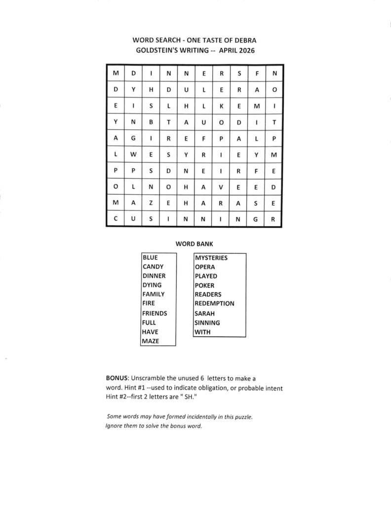 Welcome to our second puzzle entry for the month of April! This is a word search for the novels of Debra H. Goldstein. Whether you’ve read the books or not, we’re sure you’ll have fun with this word search puzzle based on the story! (If you want to download the puzzle and play offline, click here for a PDF version.)